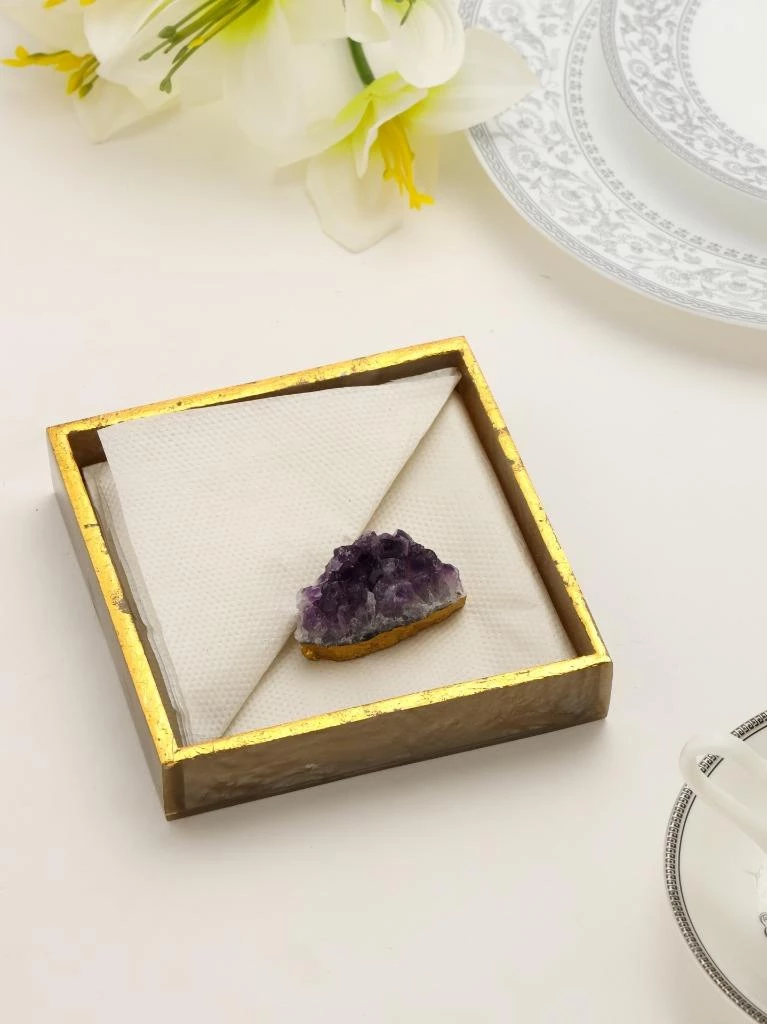 A great way to keep your napkins organized and handy. This Napkin Holder Set includes a hand-poured resin holder and an amethyst druzy. Resin/ Semi-precious Gemstone Wipe Clean with damp cloth. Made In India