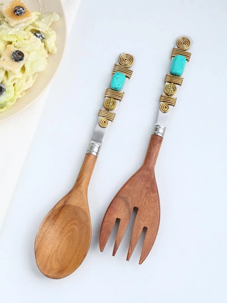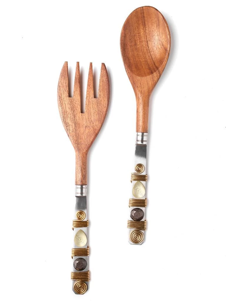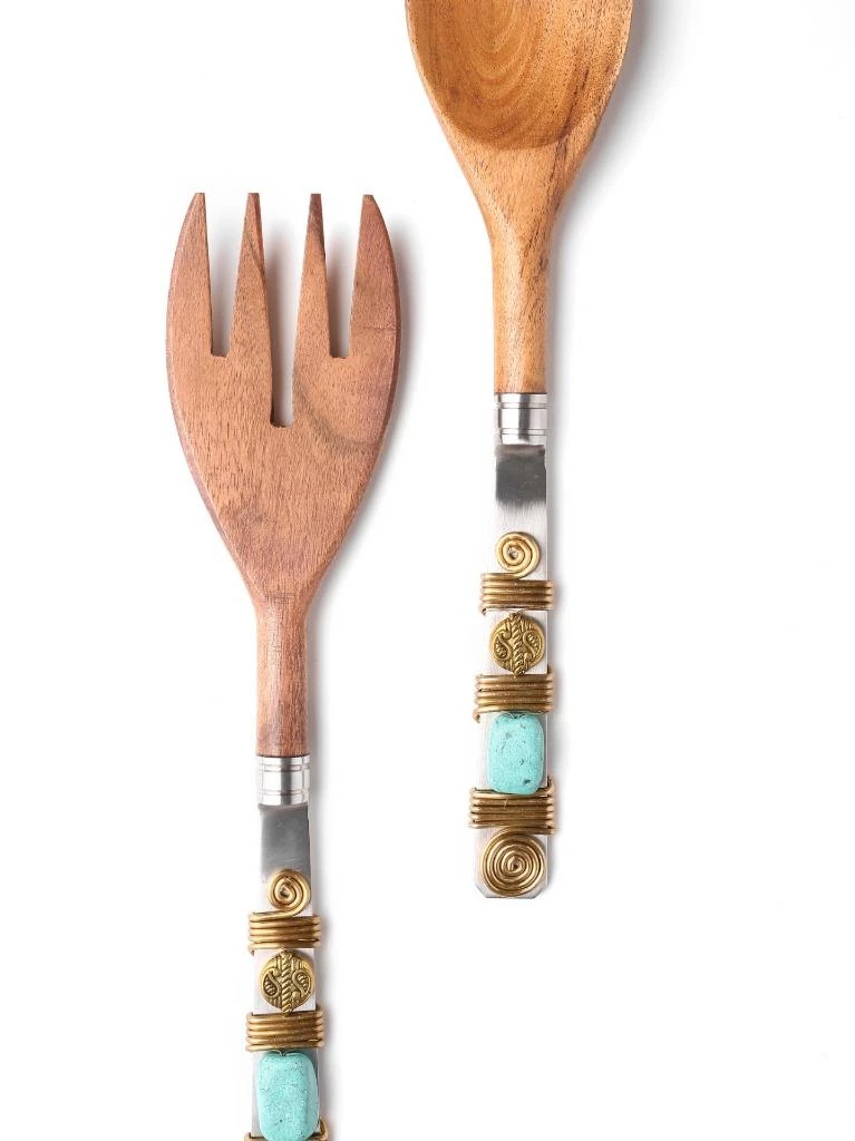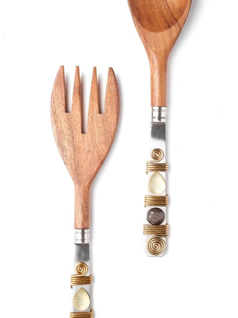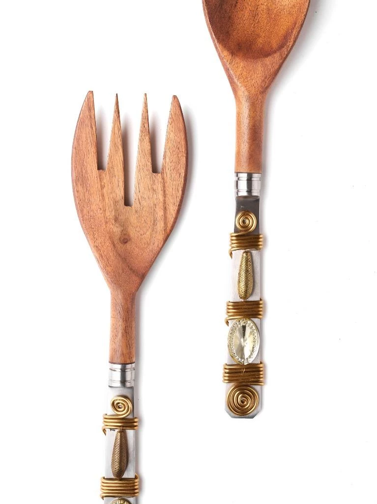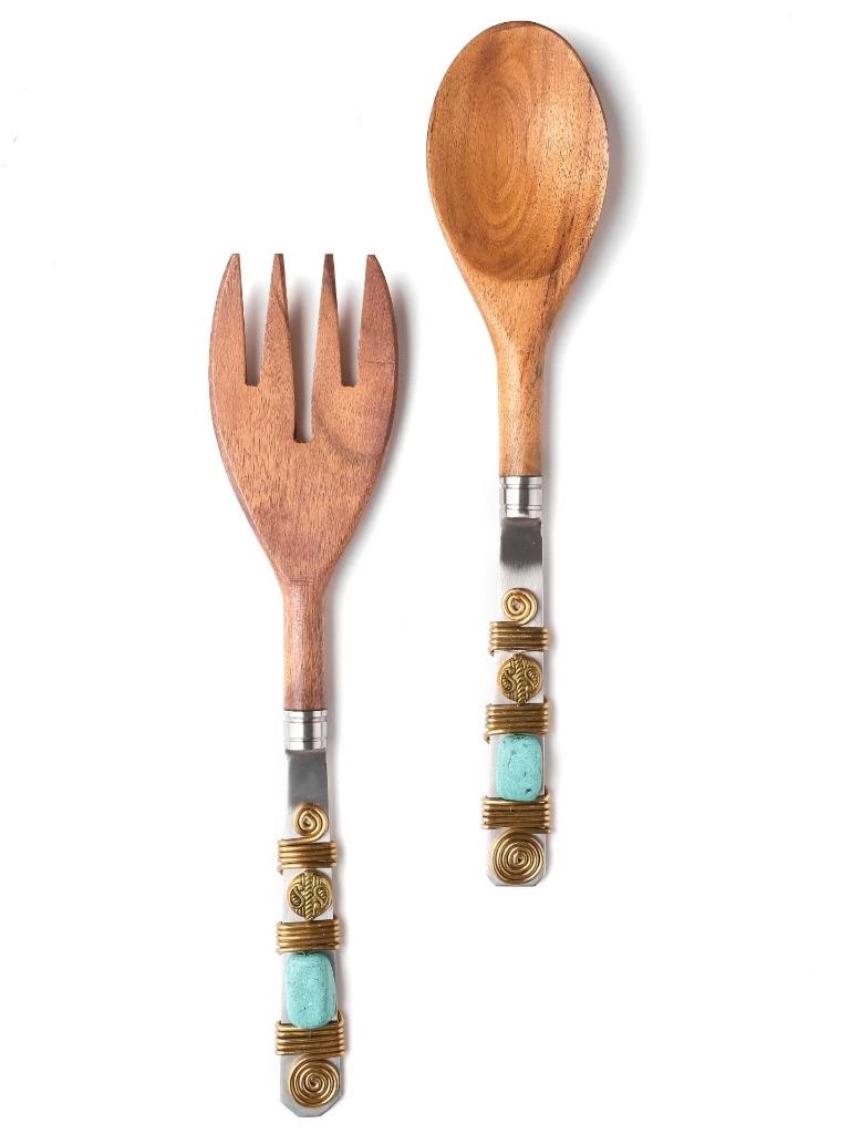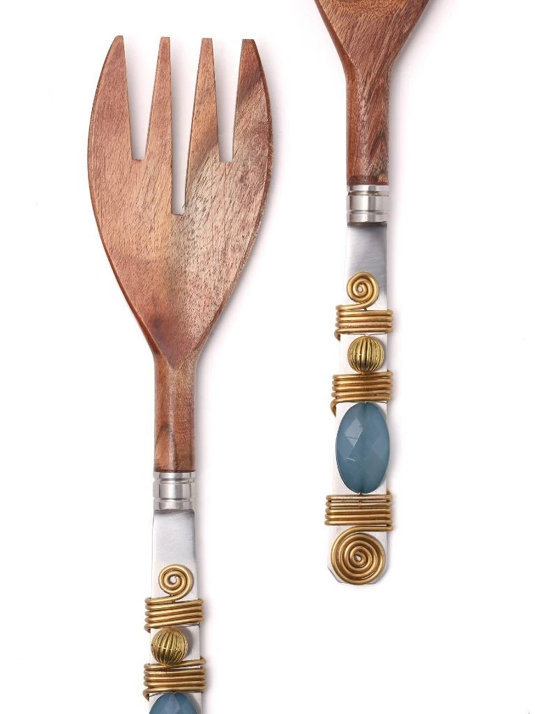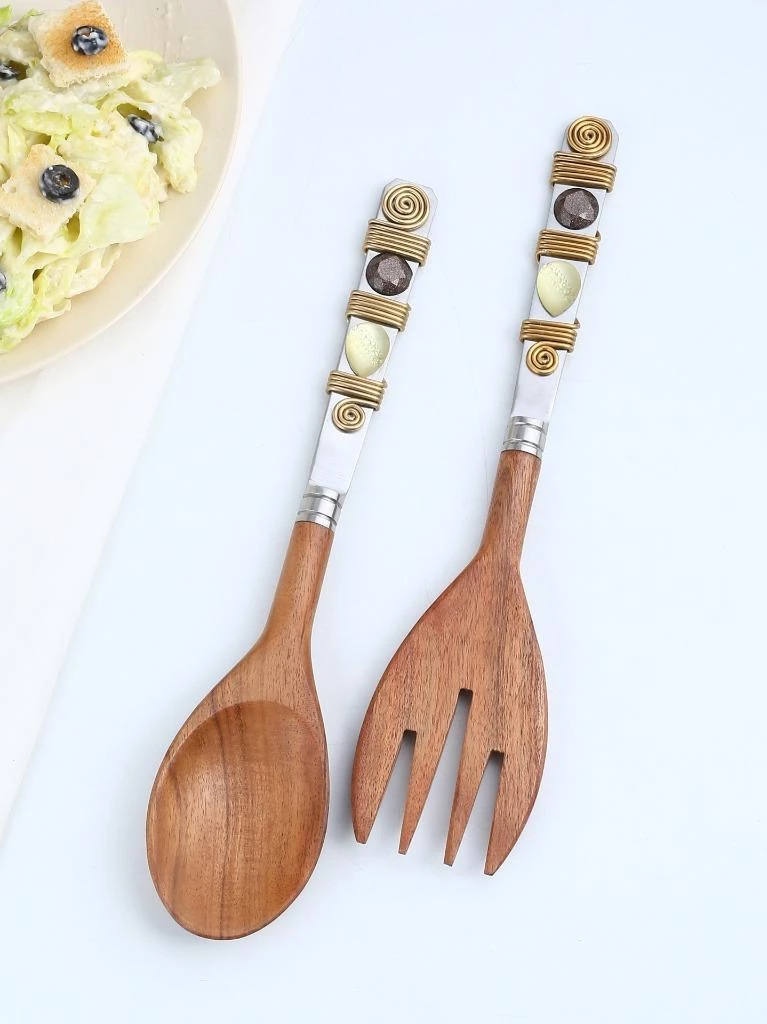 Salad fixings just got more festive with these handcrafted metal wire wrapped & beaded wooden salad serving set. Whether you use it to toss up your favorite salads and sides or gift this set to your favorite hostess, this elevated wooden utensil set works in style all week. These utensils are great for tossing leafy greens, seasonal fruit salads, and piping-hot side dishes. Care Instructions- Hand wash only