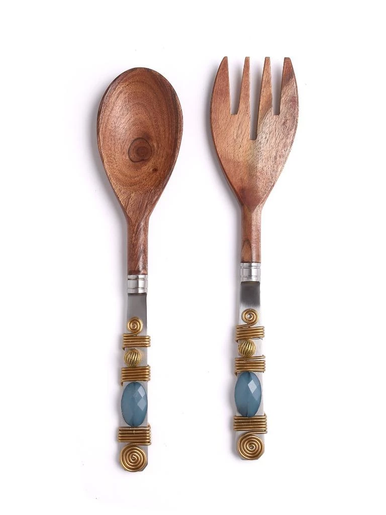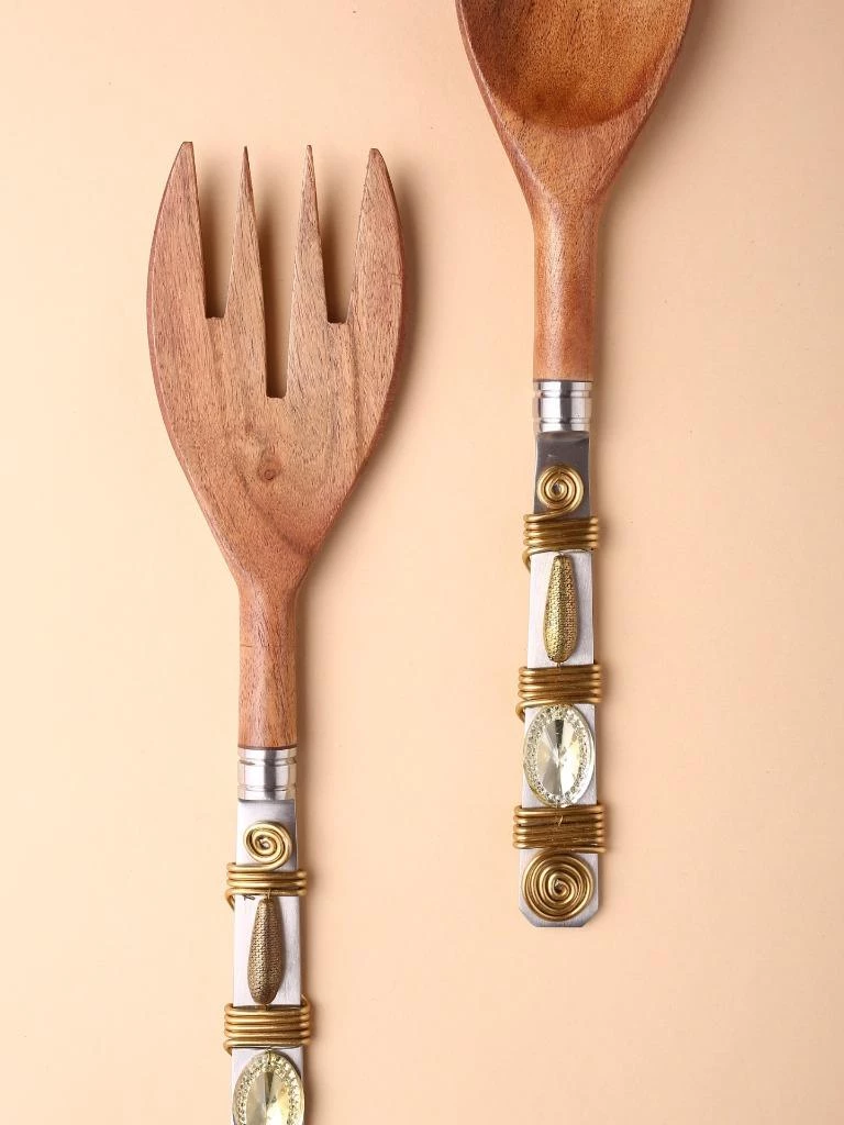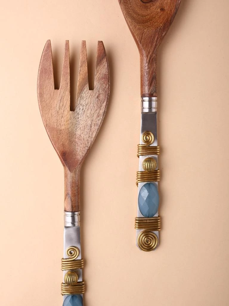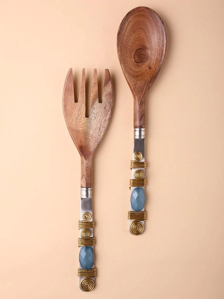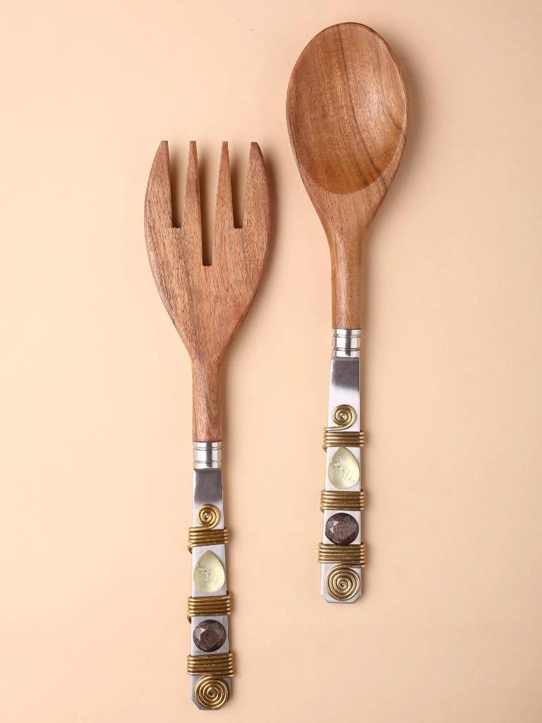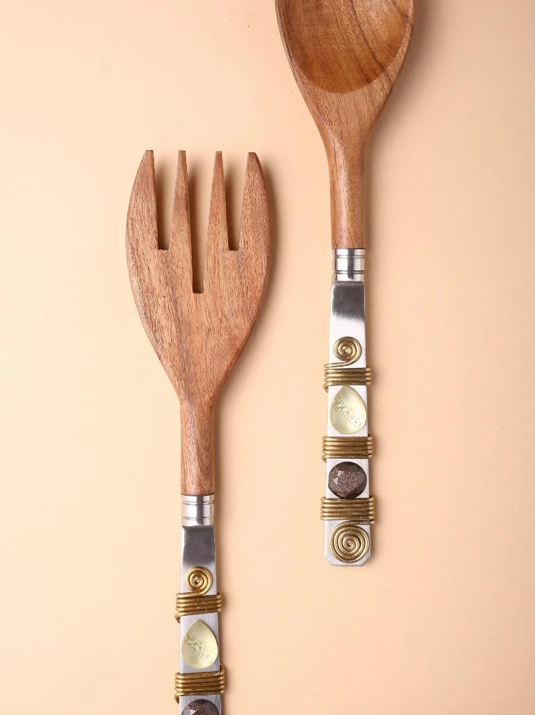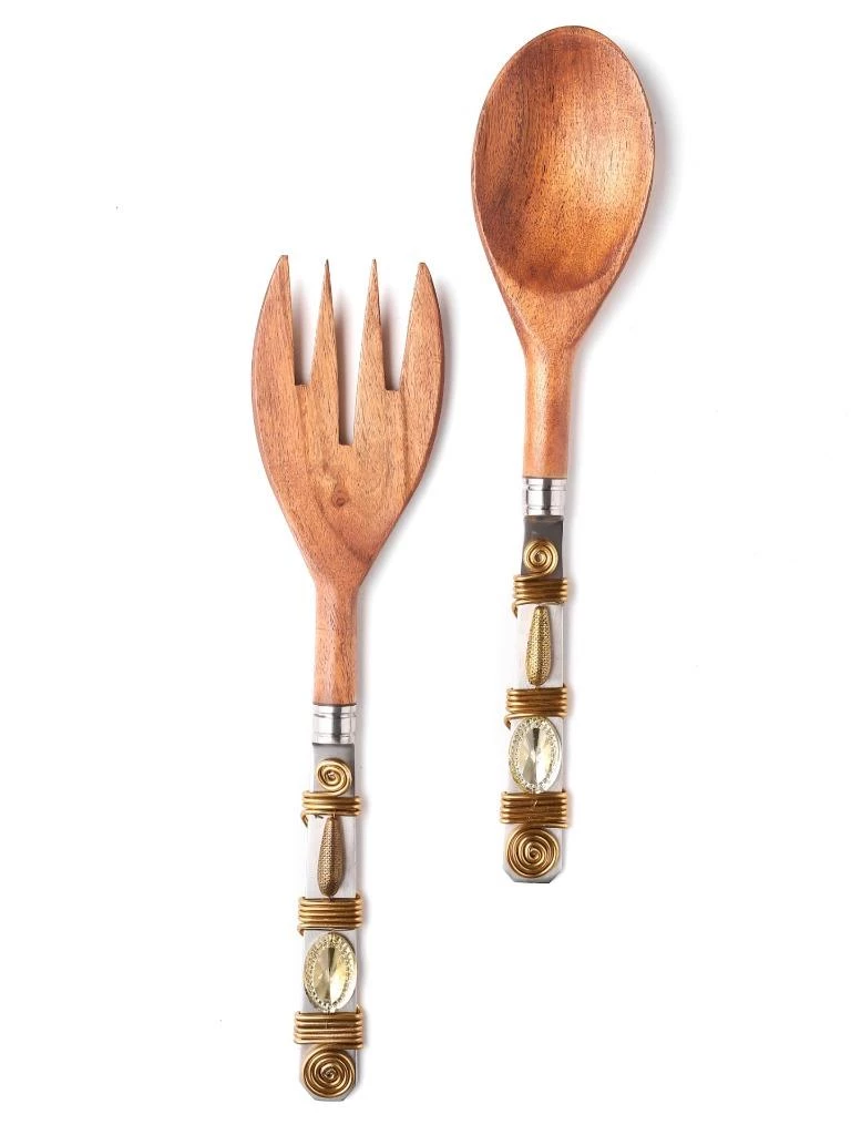 Salad fixings just got more festive with these handcrafted metal wire wrapped & beaded wooden salad serving set. Whether you use it to toss up your favorite salads and sides or gift this set to your favorite hostess, this elevated wooden utensil set works in style all week. These utensils are great for tossing leafy greens, seasonal fruit salads, and piping-hot side dishes. Care Instructions- Hand wash only