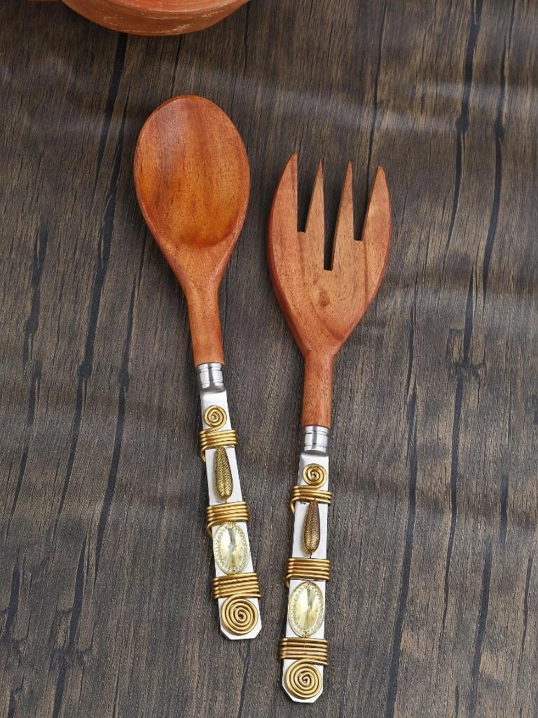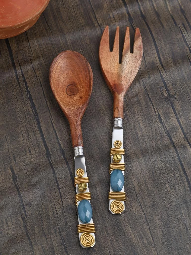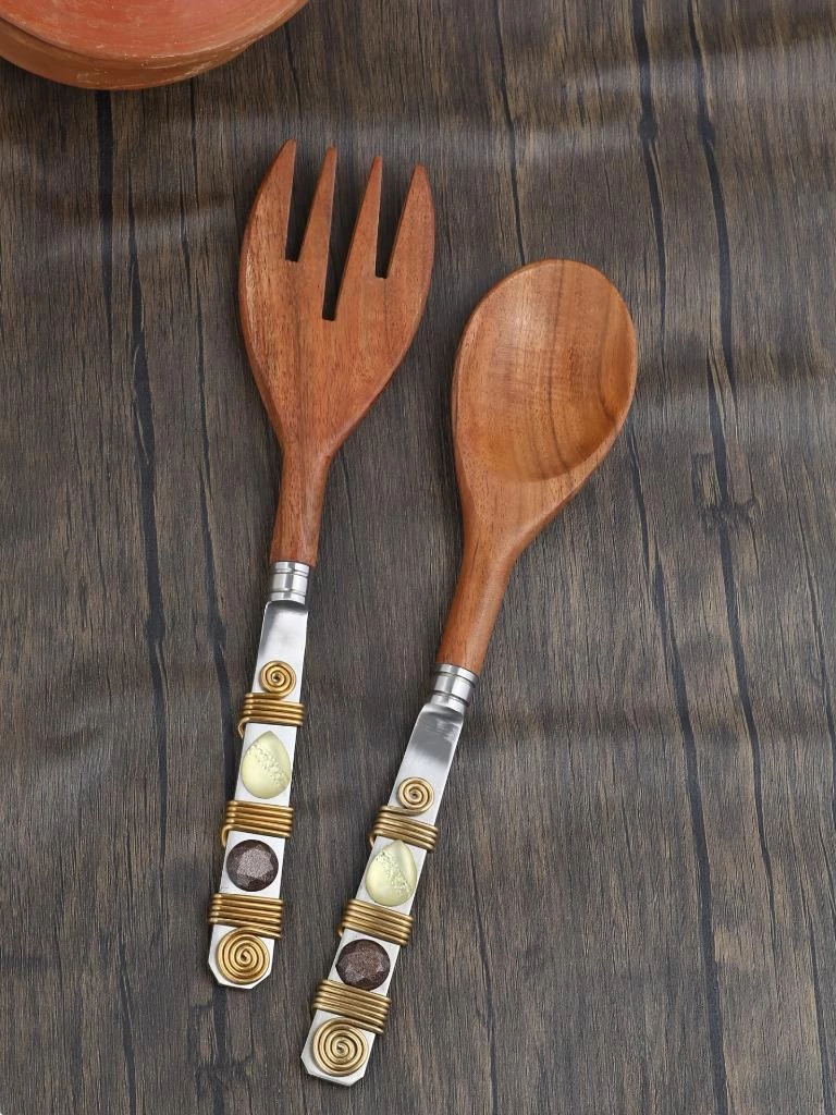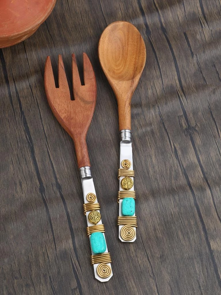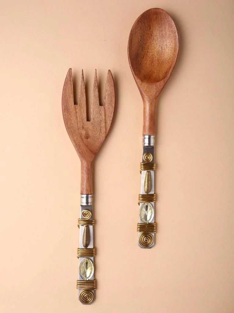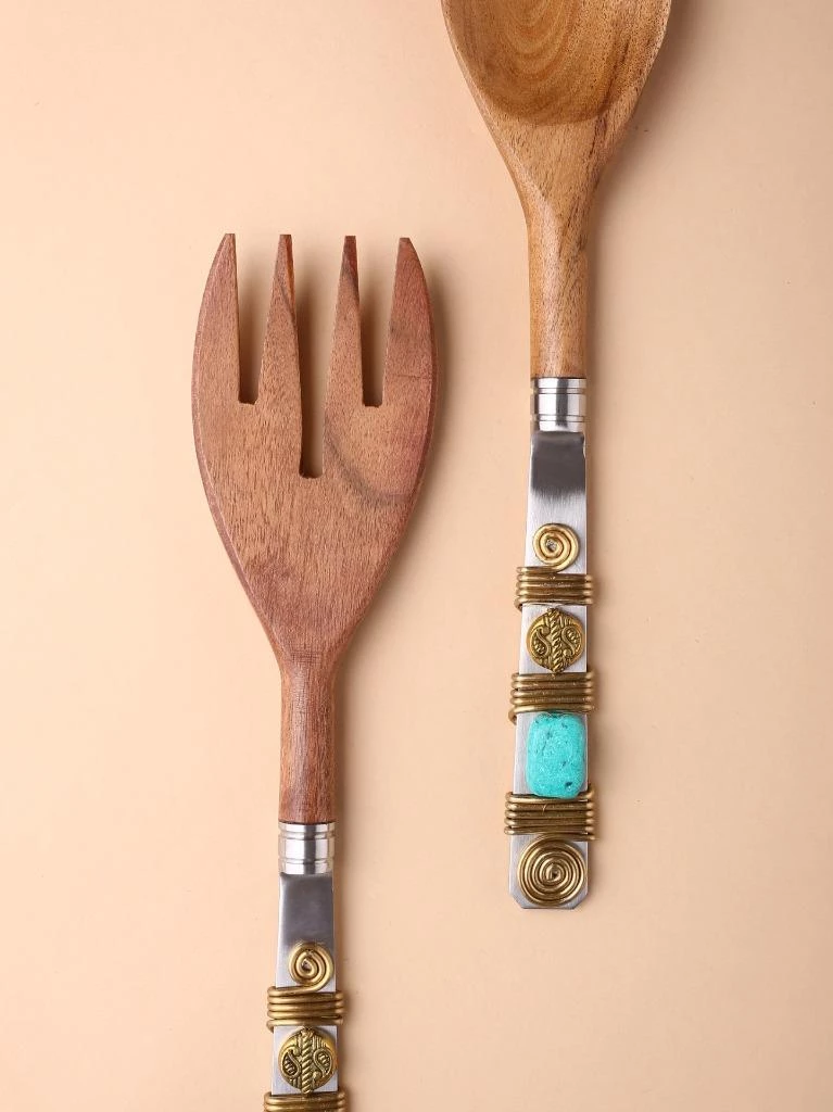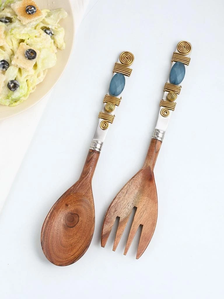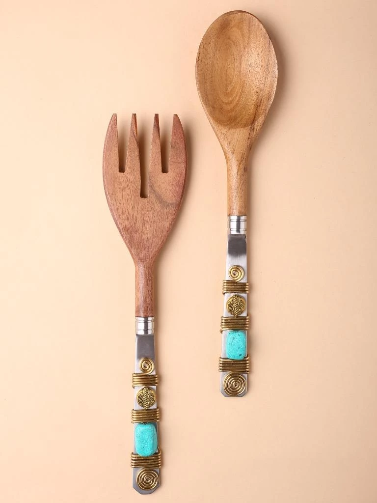 Salad fixings just got more festive with these handcrafted metal wire wrapped & beaded wooden salad serving set. Whether you use it to toss up your favorite salads and sides or gift this set to your favorite hostess, this elevated wooden utensil set works in style all week. These utensils are great for tossing leafy greens, seasonal fruit salads, and piping-hot side dishes. Care Instructions- Hand wash only