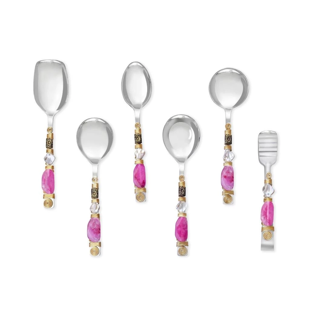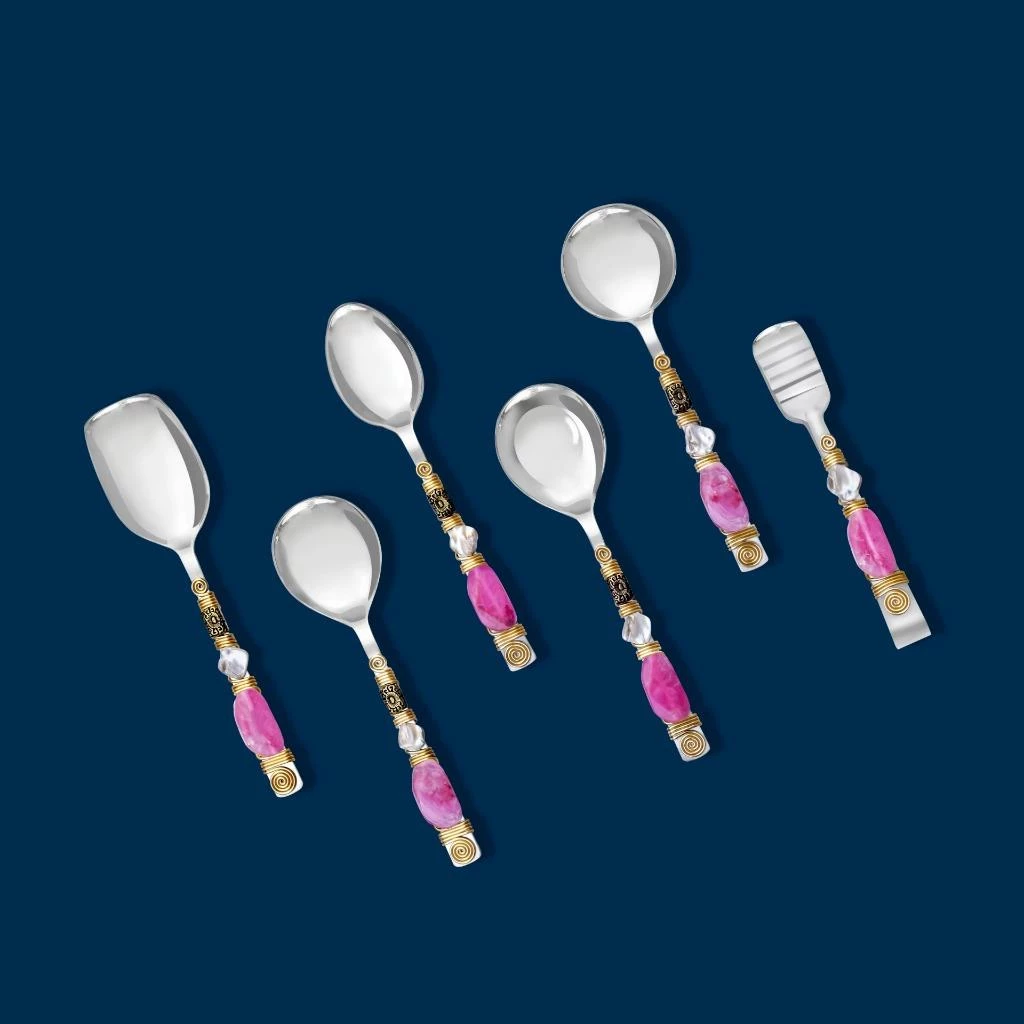 Perfectly handcrafted with food grade stainless steel and resin beads and mother of pearl beads, this set adds depth and character to any setting. The set is perfect for serving any cuisine. This Pink Cascade Serving Set is a part of ” Color Splash by Tiramisu” collection. Ornate Serving Spoon Set of 6 Stainless Steel, Resin, Beads, Mother-of-Pearl Hand-wash and dry immediately. Handcrafted In India