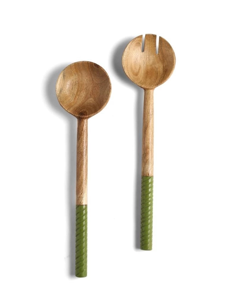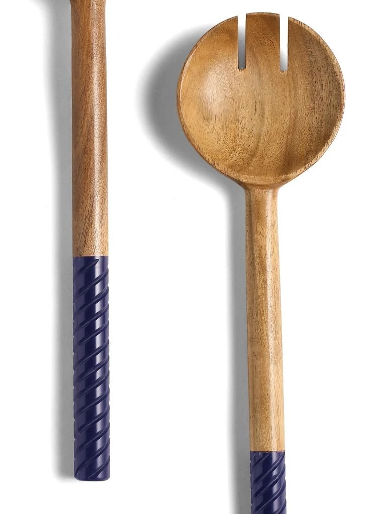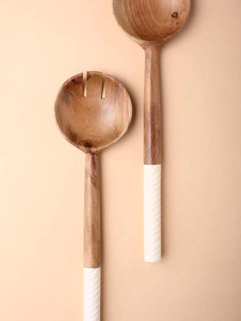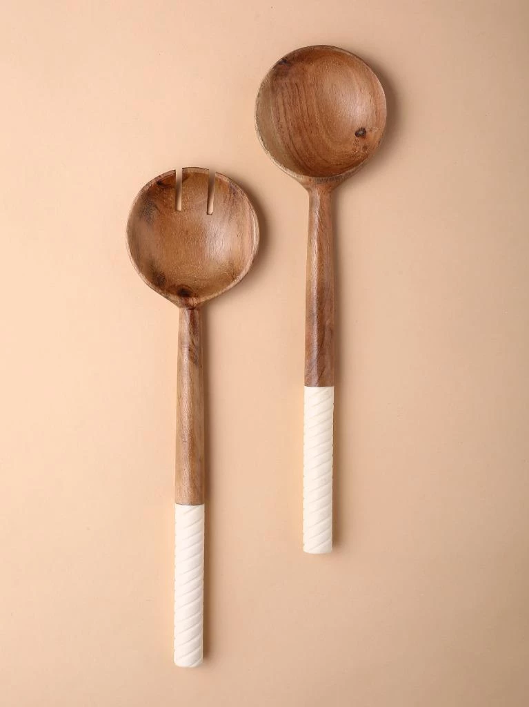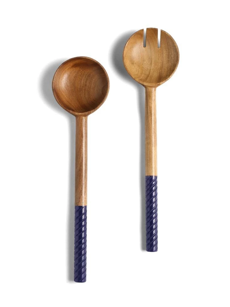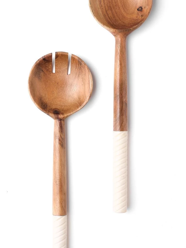 Rich acacia-wood bowls and handcrafted swirling resin handles pair up for a lovely, striking set of salad servers. Care Instructions- Hand wash only