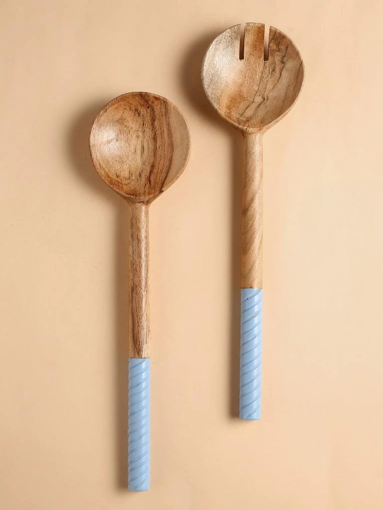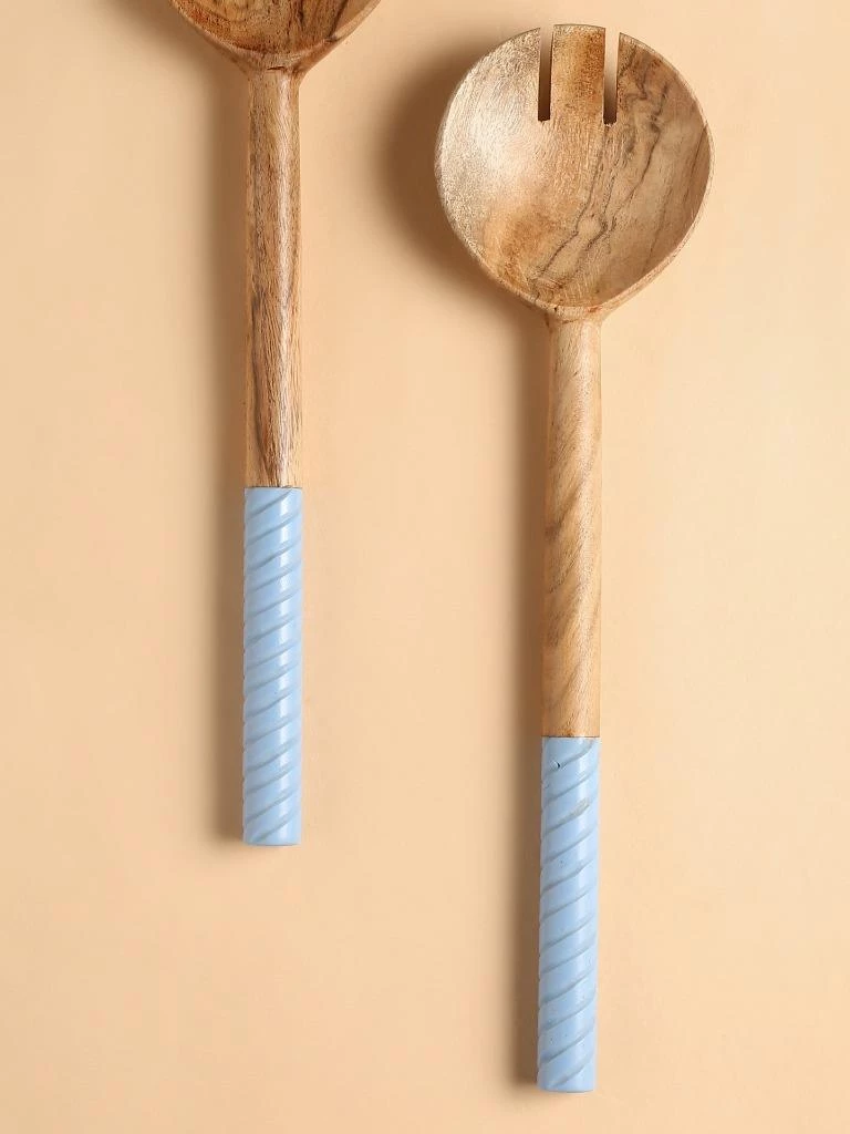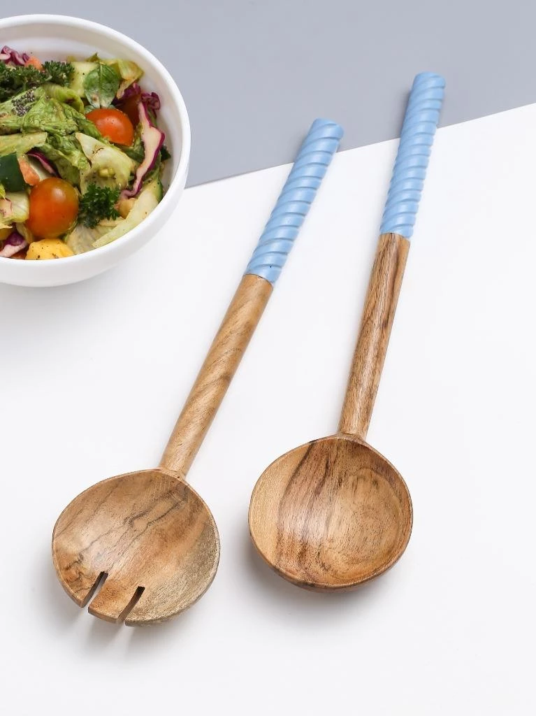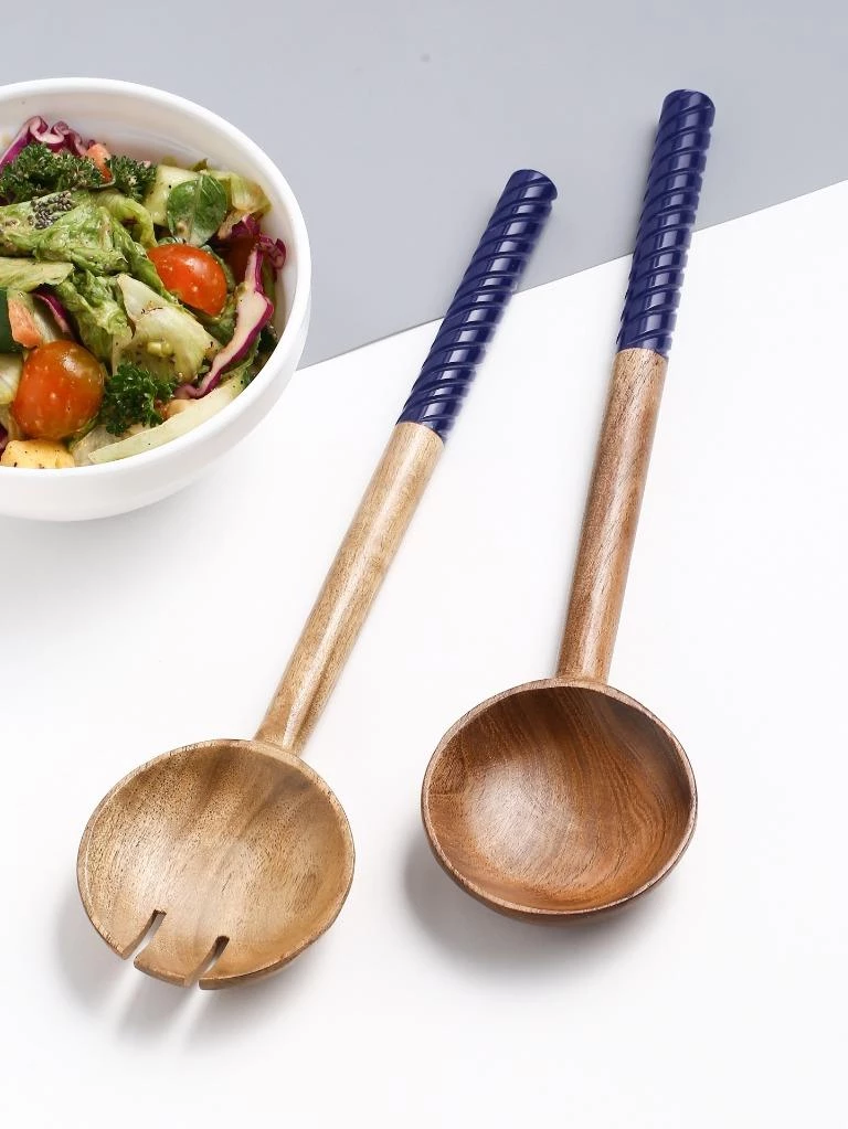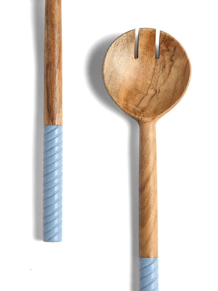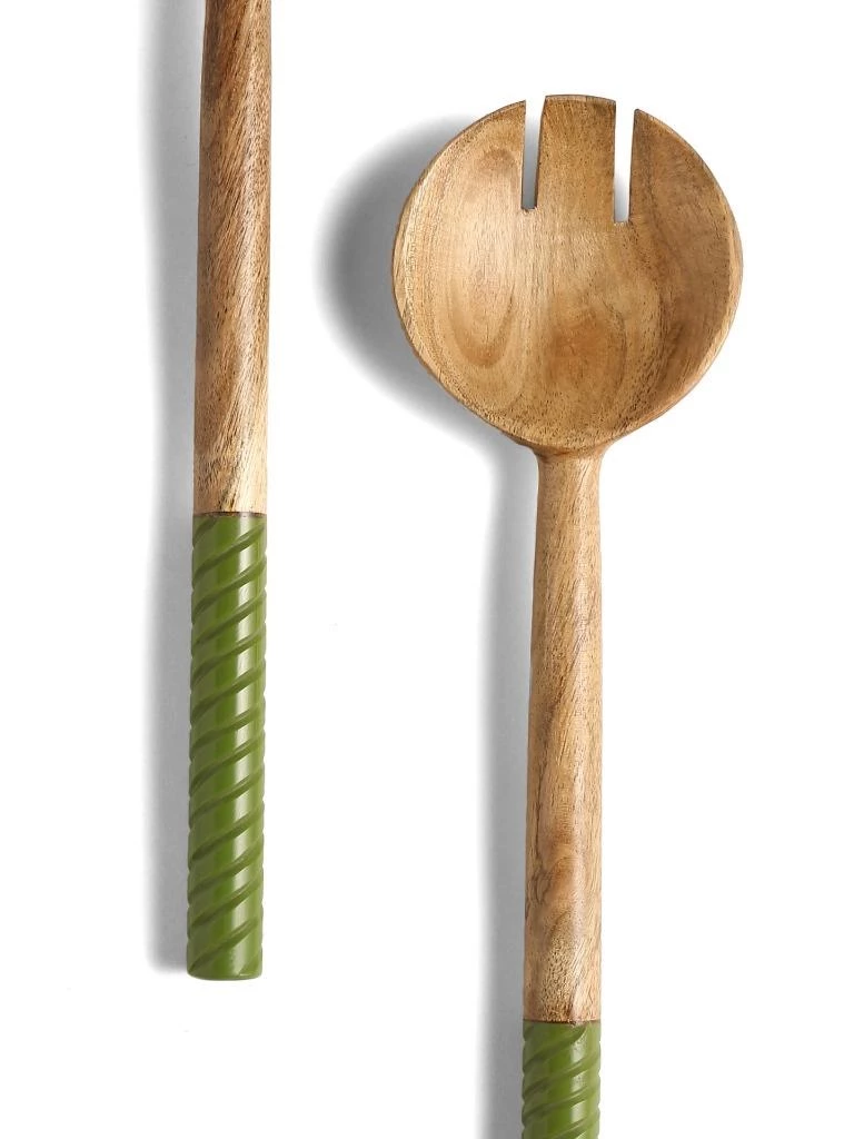 Rich acacia-wood bowls and handcrafted swirling resin handles pair up for a lovely, striking set of salad servers. Care Instructions- Hand wash only