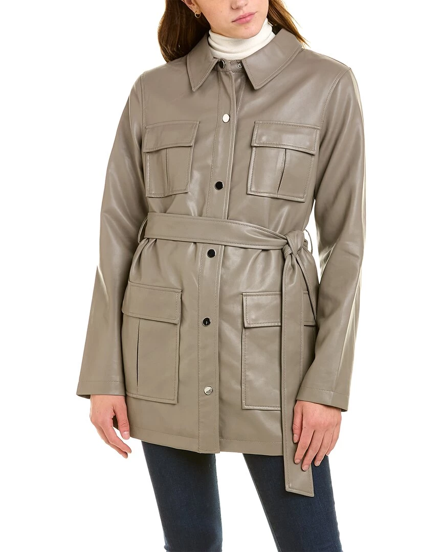 - Design Details – Faux Leather Construction, Spread Collar, Four Front Flap Pockets And Self-Tie Belt At Waist